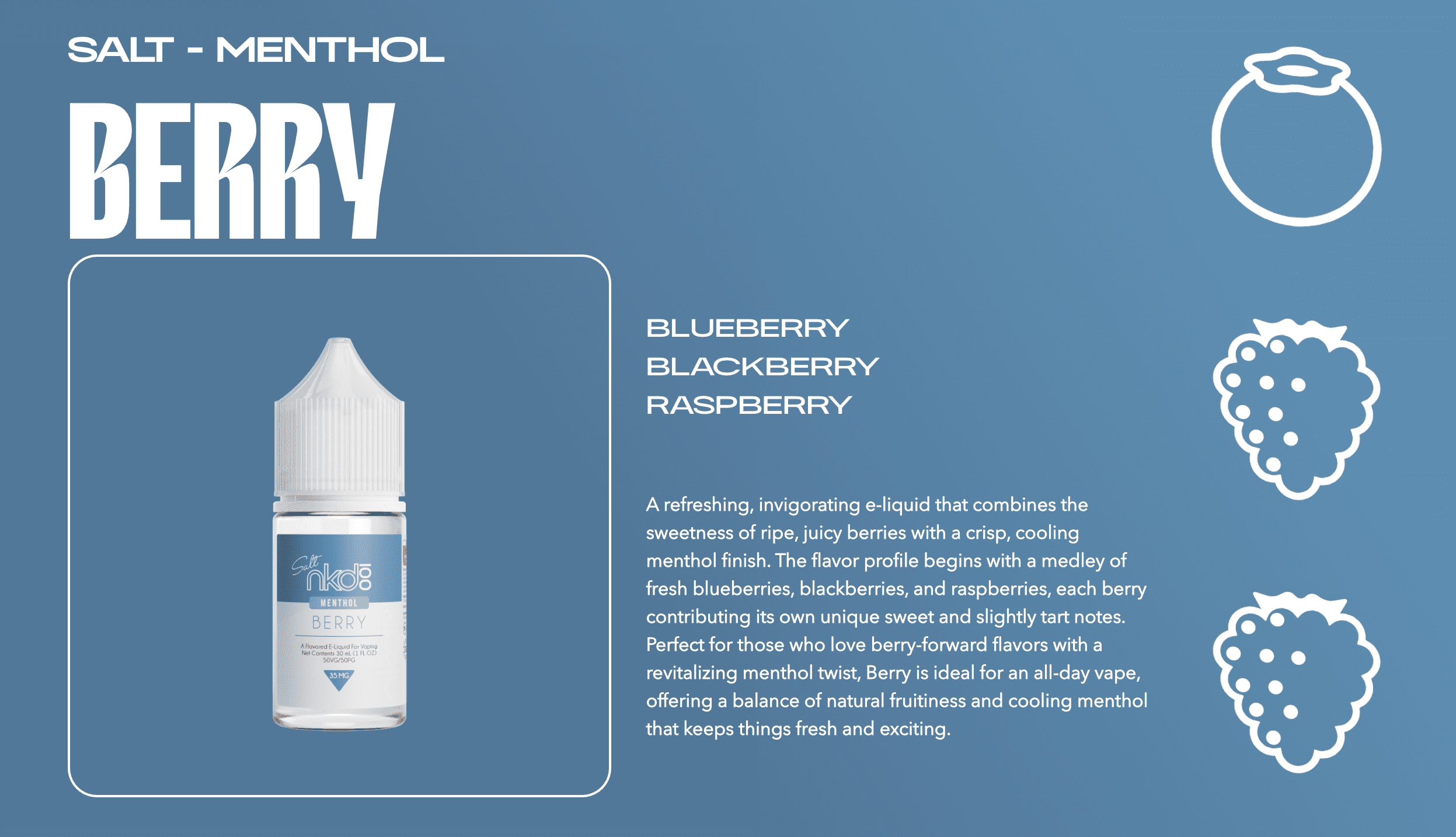 NAKED 100® Berry Menthol Salt blends rich mixed berries with a chilled menthol breeze, creating a smooth, fruity experience.