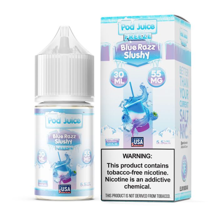 POD JUICE® Blue Razz Slushy Freeze Salt kicks up the classic blue razz slushy with an extra layer of icy menthol, creating a sharper, frostier twist.