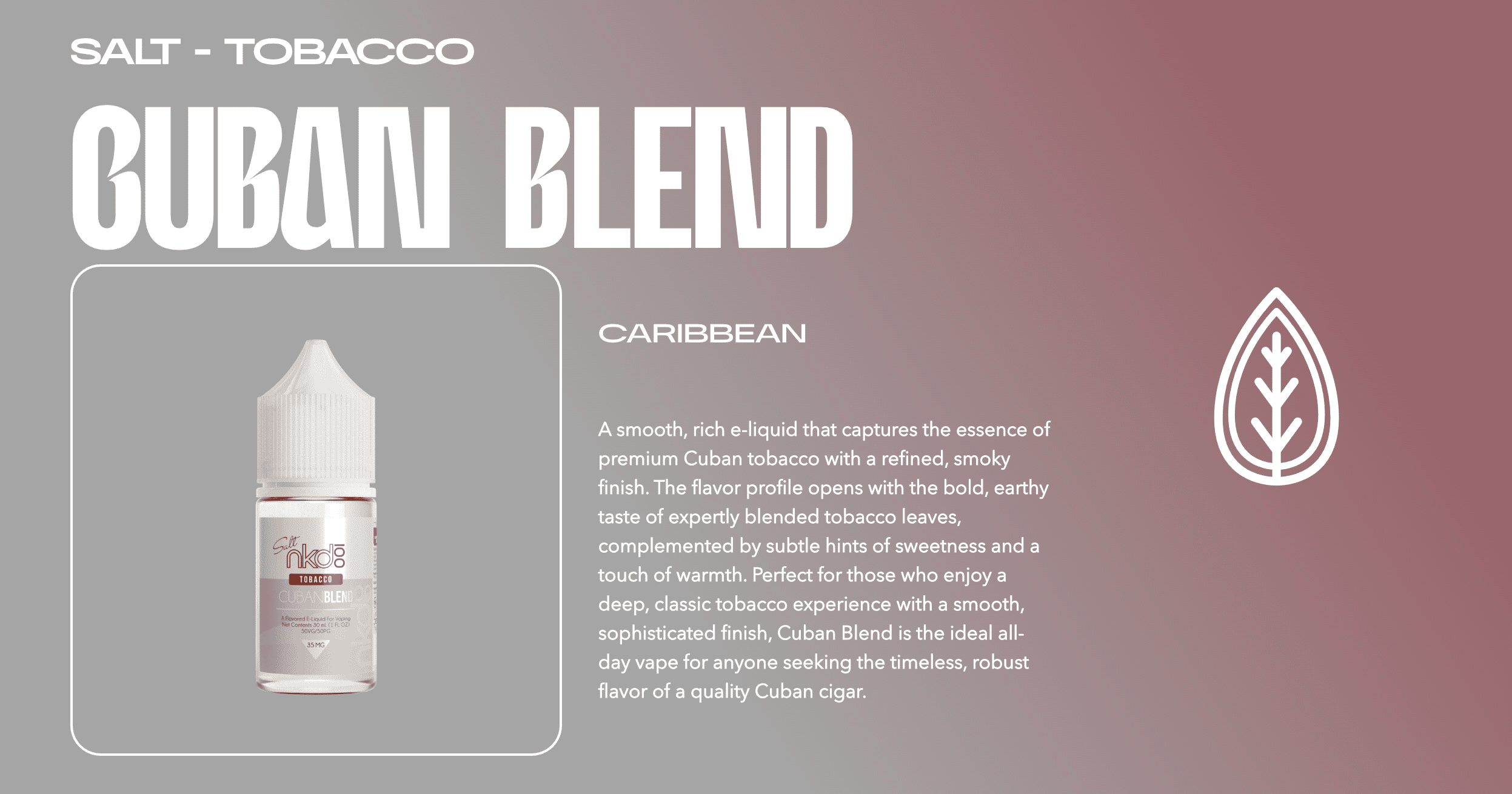 NAKED 100® Cuban Blend Tobacco Salt evokes the rich tradition of hand-rolled cigars with a smooth, full-bodied tobacco flavor.