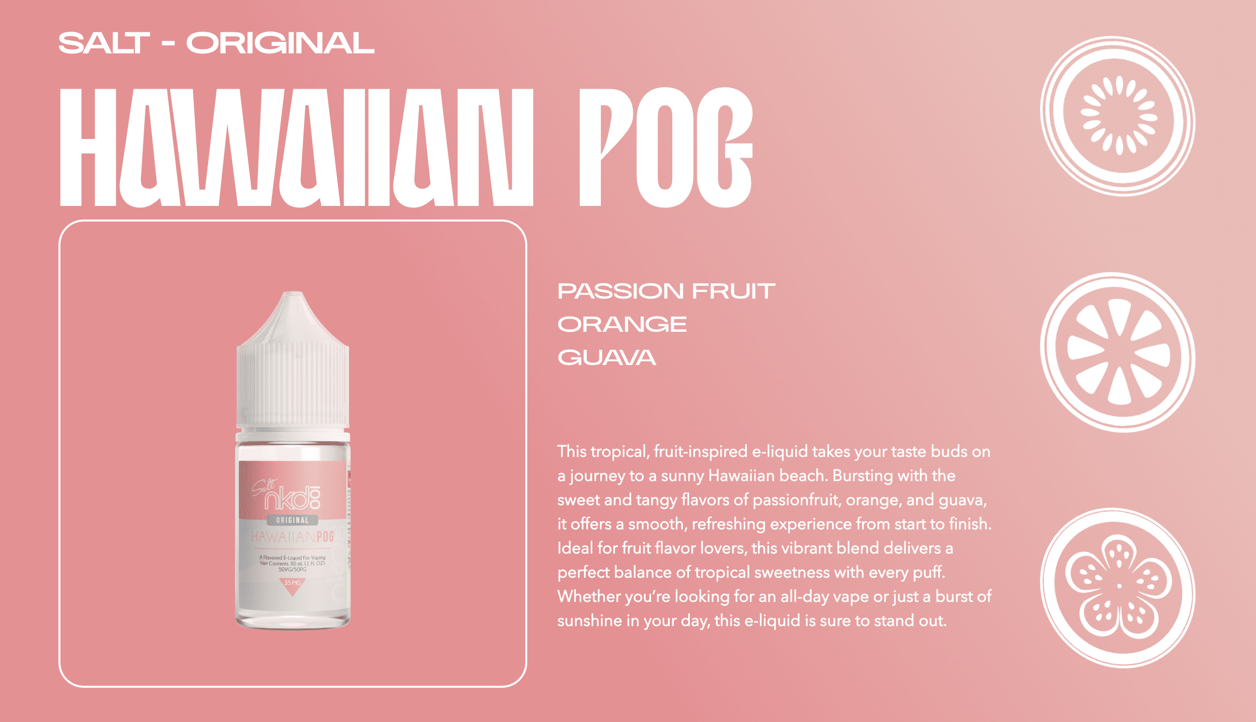 NAKED 100® Hawaiian POG Salt is a masterful blend of passion fruit, orange, and guava, offering a tropical escape in every puff with smooth, premium flavor.