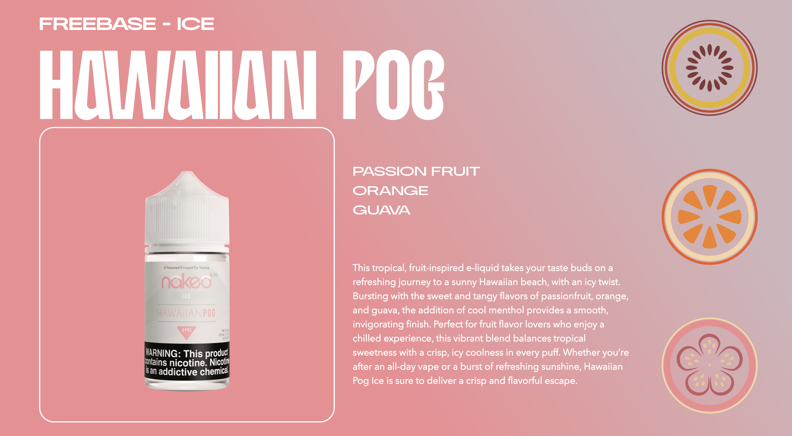 NAKED 100® Hawaiian POG Ice enhances its exotic blend of passion fruit, orange, and guava with a refreshing menthol twist, creating a crisp and vibrant tropical getaway.