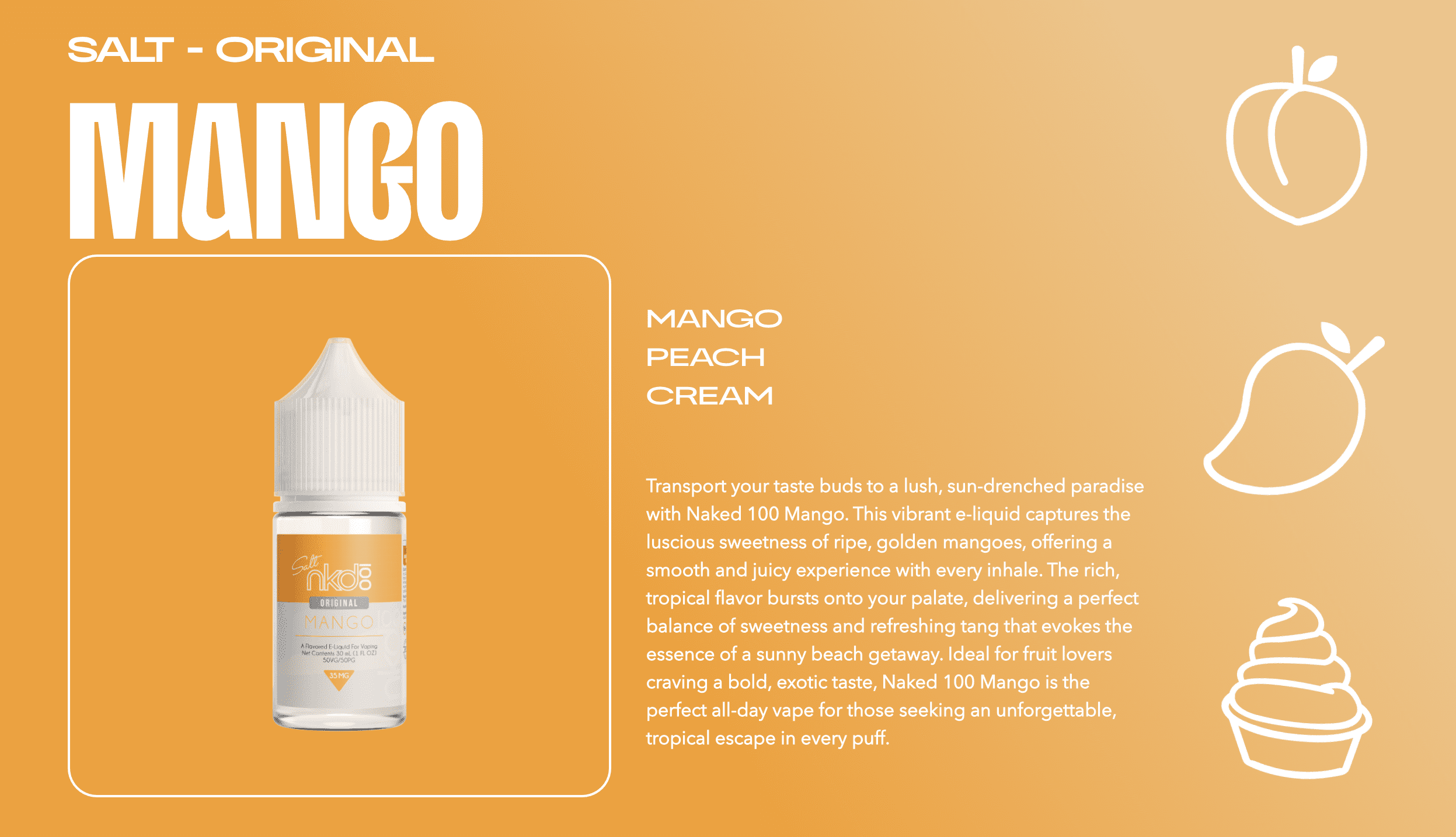 NAKED 100® Mango Salt delivers rich, sun-ripened mango flavor with velvety smoothness, offering a tropical experience that’s both elegant and intensely satisfying.
