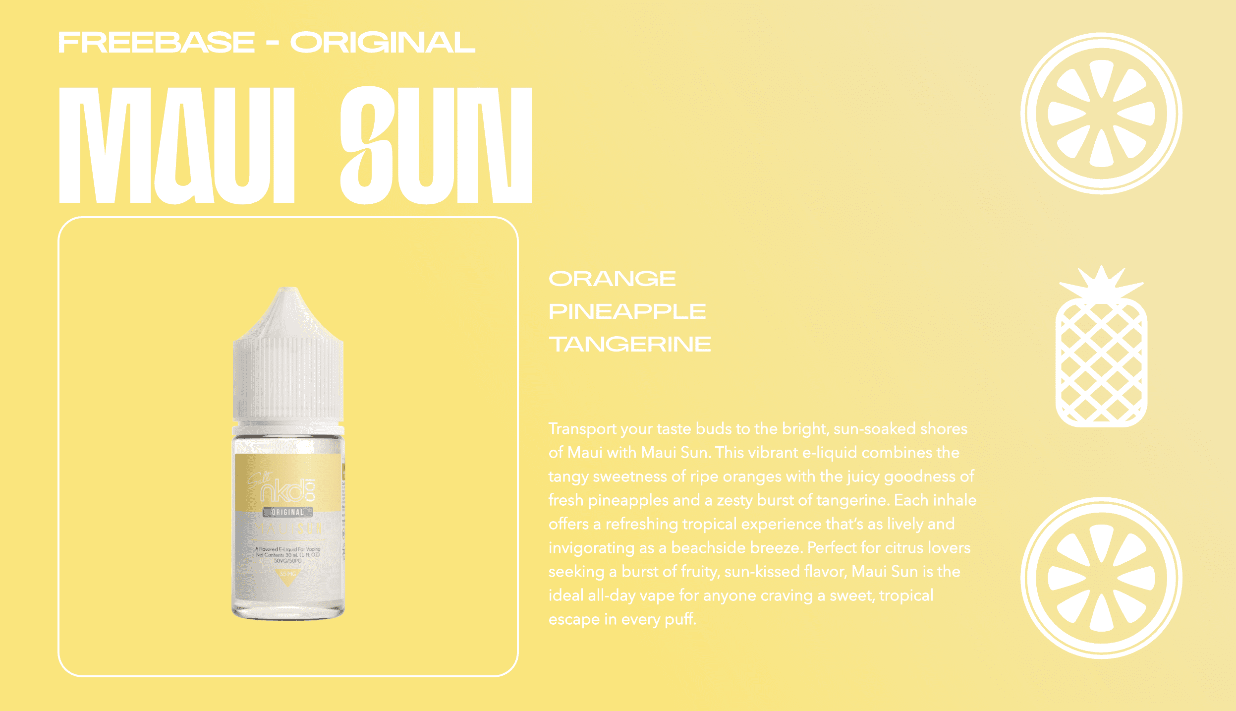 NAKED 100® Maui Sun Salt fuses bright pineapple, sweet orange, and tangerine into a radiant, tropical vape that delivers citrus flavor with a smooth, luxurious finish.